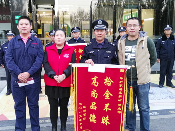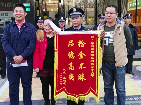 2015年10月23日18是許,保安李明寶在當(dāng)日營業(yè)結(jié)束清場檢查時(shí),在張家口華耐高新店商場南區(qū)3層衛(wèi)生間撿到1只皮挎包,立即教到物業(yè)部值班室,經(jīng)值班人員共同檢查,內(nèi)有包括汽車鑰匙、多張信用卡、駕駛證等物品。19時(shí)30分,失主前來尋找。次日上午,為感謝李明寶,失主專程送來“拾金不昧,品德高尚”錦旗一面。