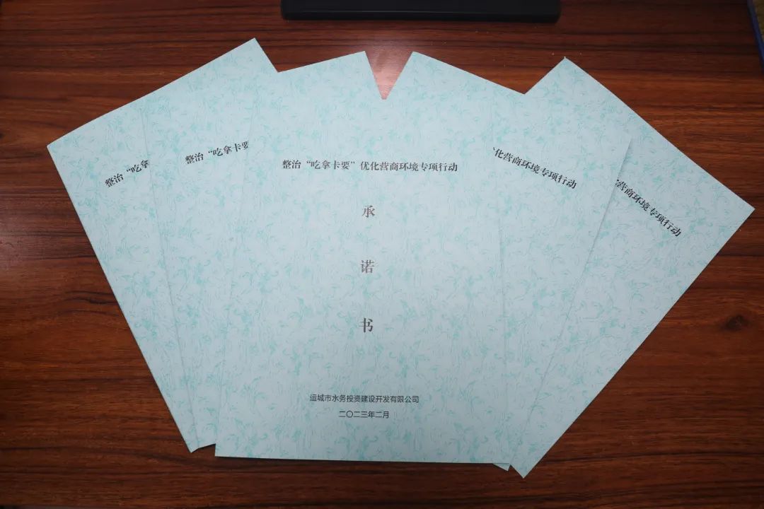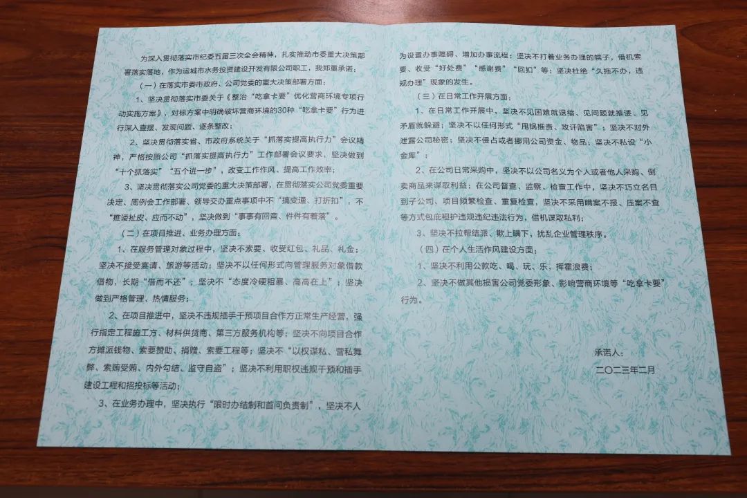 會上,公司黨委委員、紀(jì)委書記王望寬宣讀了市水投公司《整治“吃拿卡要”優(yōu)化營商環(huán)境專項(xiàng)行動實(shí)施方案》。根據(jù)此次專項(xiàng)行動提出的30種“吃拿卡要”行為,結(jié)合公司實(shí)際,從落實(shí)市委市政府、公司黨委的重大決策部署方面;項(xiàng)目推進(jìn)、業(yè)務(wù)辦理方面;日常工作開展方面;個(gè)人生活作風(fēng)建設(shè)方面,制作了水投公司整治“吃拿卡要”優(yōu)化營商環(huán)境專項(xiàng)行動承諾書。