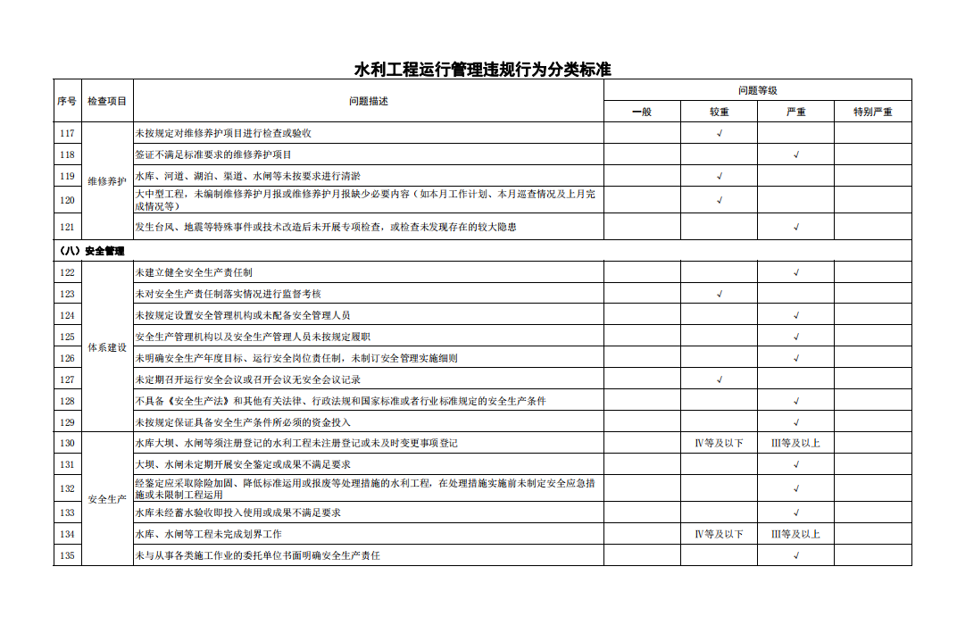 第十一條 對檢查發(fā)現(xiàn)的運(yùn)行管理問題按照運(yùn)行管理違規(guī)行為分類標(biāo)準(zhǔn)和工程缺陷分類標(biāo)準(zhǔn)進(jìn)行認(rèn)定。