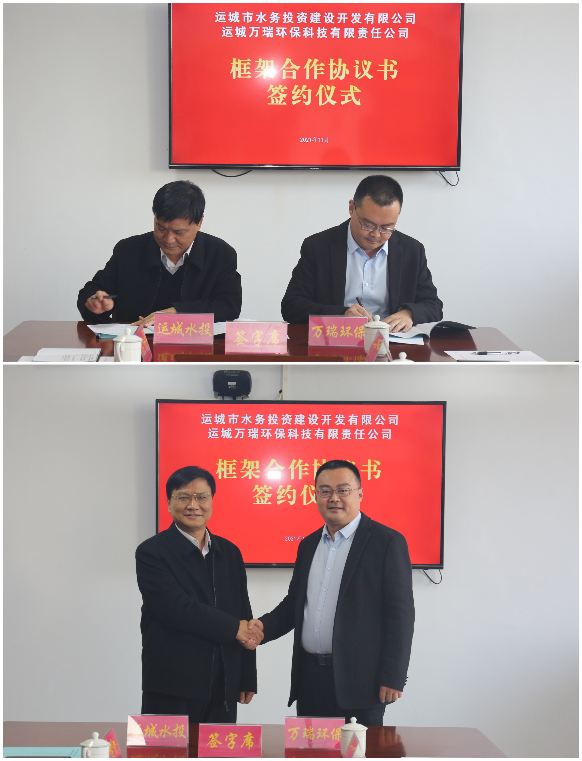 11月5日,運(yùn)城市水務(wù)投資建設(shè)開發(fā)有限公司(以下簡稱市水投公司)與運(yùn)城萬瑞環(huán)??萍加邢挢?zé)任公司(以下簡稱萬瑞環(huán)保公司)框架合作協(xié)議簽約儀式,在市水投公司隆重舉行。