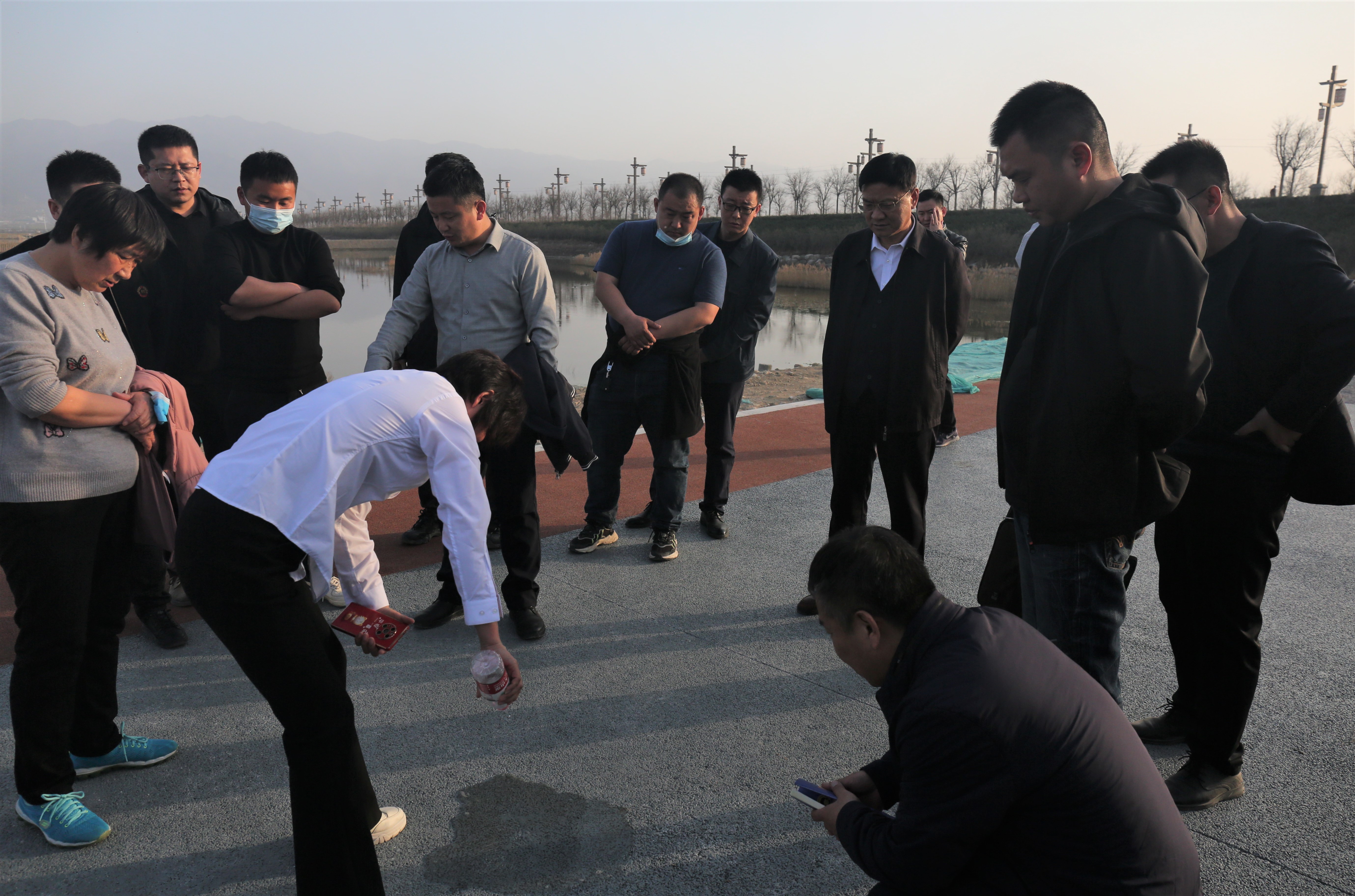 ▲測(cè)試路面滲水效果