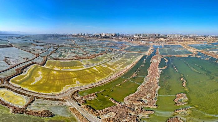 運(yùn)城鹽湖是世界三大硫酸鈉型內(nèi)陸鹽湖之一,總面積約132平方公里,形狀宛如一條玉帶,蜿蜒在中條山下。鹽湖中的藻類和鹽水蟲繁殖,造成湖水變幻出各種顏色,七彩兼?zhèn)?,宛如一個(gè)巨型調(diào)色盤,各色顏料飽滿流溢、異彩紛呈。