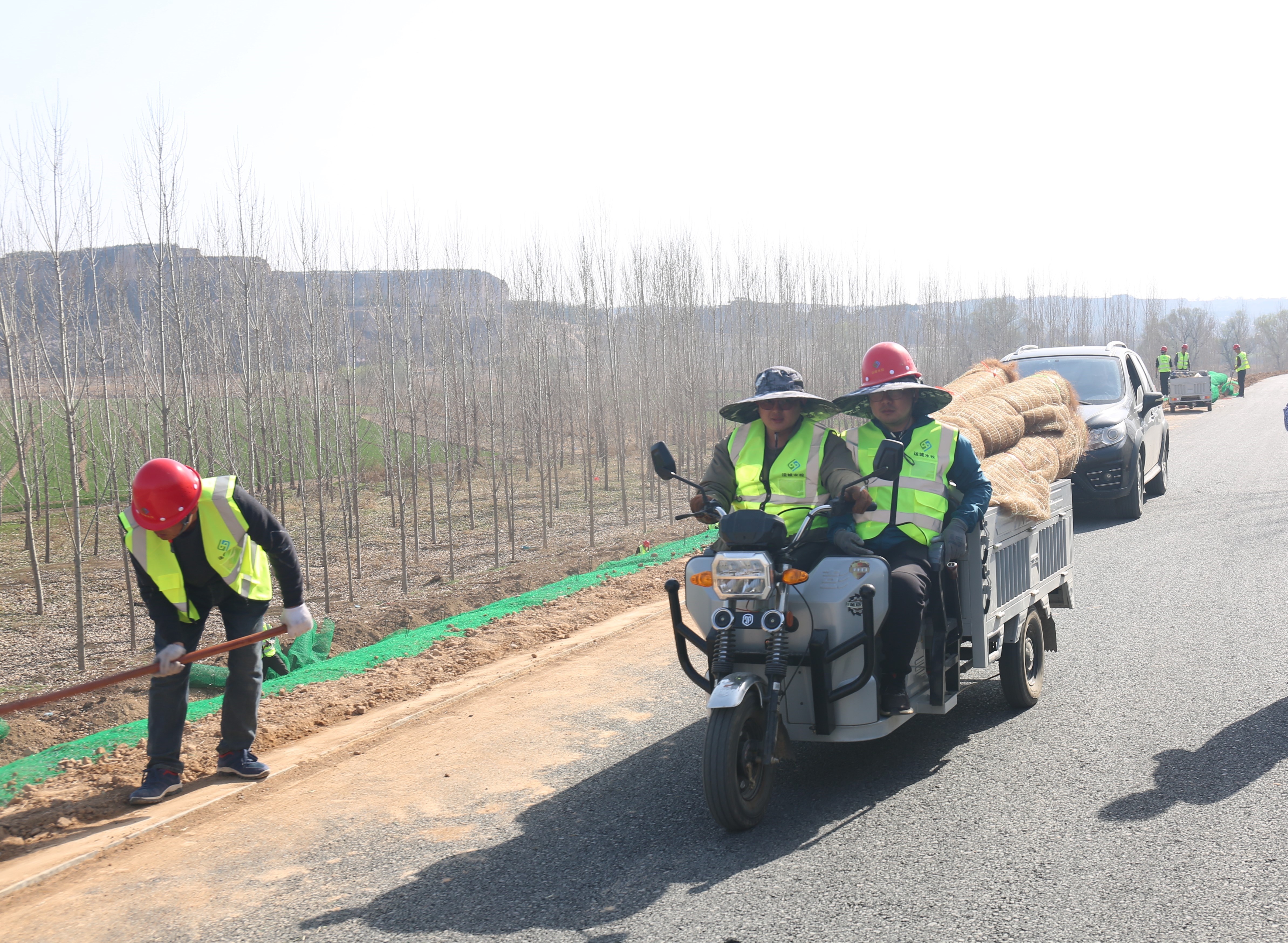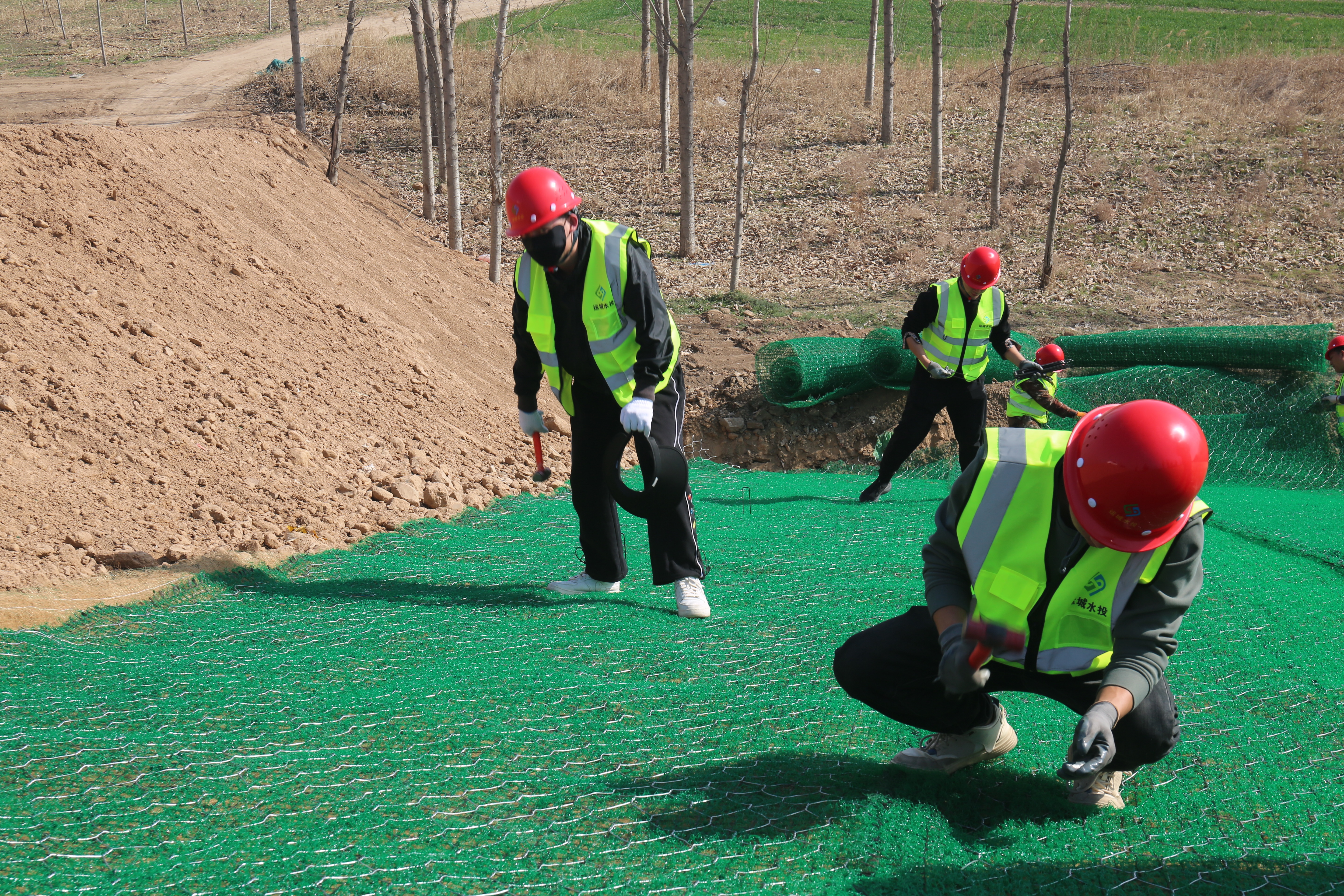 施工現(xiàn)場(chǎng),工程機(jī)械、運(yùn)輸車輛、施工人員正在加緊作業(yè)。一片片椰絲毯經(jīng)過(guò)清除坡面雜物、坡度整修、開挖坑槽、播撒草籽等八道程序才能完好鋪設(shè)在大壩上。椰絲毯是一種新型環(huán)保材料,具有良好的吸水性、保濕性和透氣性,這種環(huán)保材料既可以起到穩(wěn)固河道邊坡、防止河岸沖刷破壞的作用,同時(shí)還能優(yōu)化生態(tài)環(huán)境。
